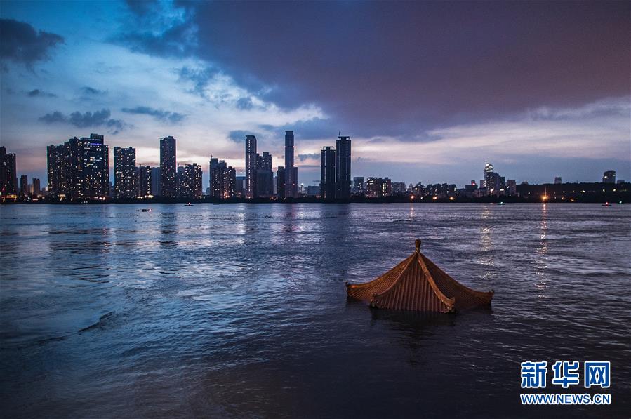 上涨的江水即将淹没武昌黄花矶凉亭(7月13日摄)。新华社记者 肖艺九 摄
