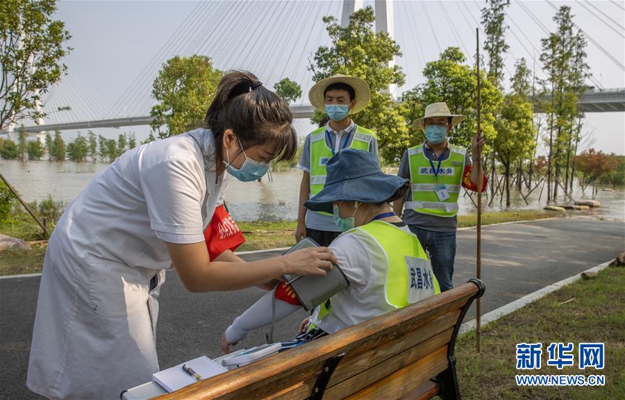 7月24日,在武汉青山江滩罗家港防汛值守哨棚旁,武昌区杨园街社区卫生服务中心医务人员为巡堤员测量血压和心率。从7月6日开始,该中心医务人员携带医药箱和消毒器具每天两次往返于3.7公里的长江岸堤,为巡堤员测量血压、监测体温,并宣传防疫知识。新华社记者 肖艺九 摄